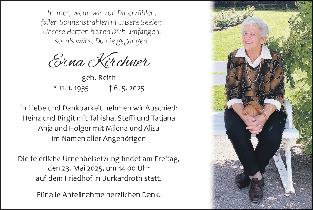 Hier finden Sie alle Traueranzeigen aus der Zeitung, die bisher für Erna Kirchner erschienen sind. Weitere Traueranzeigen, die in der Zeitung erscheinen, werden hier ebenfalls aufgelistet