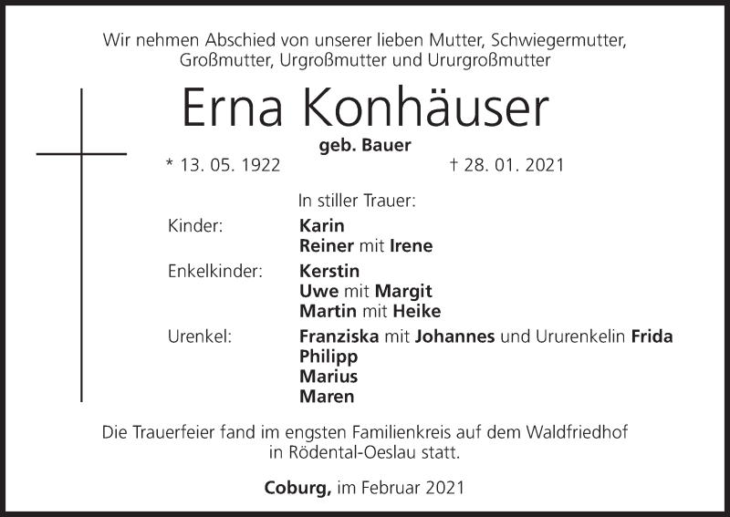 Hier finden Sie alle Traueranzeigen aus der Zeitung, die bisher für Erna Konhäuser erschienen sind. Weitere Traueranzeigen, die in der Zeitung erscheinen, werden hier ebenfalls aufgelistet
