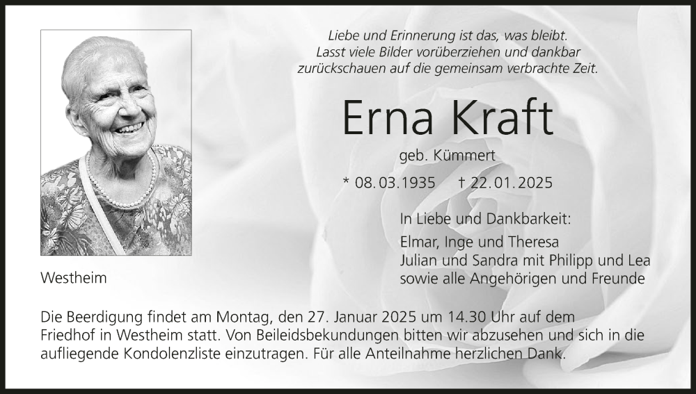 Hier finden Sie alle Traueranzeigen aus der Zeitung, die bisher für Erna Kraft erschienen sind. Weitere Traueranzeigen, die in der Zeitung erscheinen, werden hier ebenfalls aufgelistet