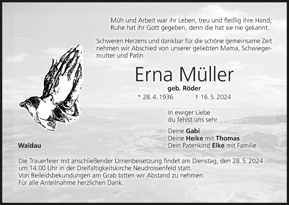 Hier finden Sie alle Traueranzeigen aus der Zeitung, die bisher für Erna Müller erschienen sind. Weitere Traueranzeigen, die in der Zeitung erscheinen, werden hier ebenfalls aufgelistet