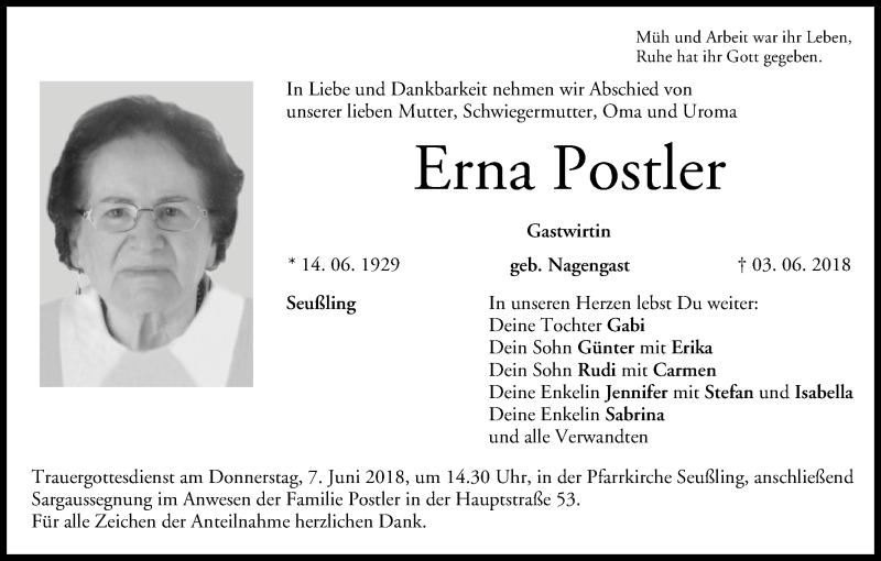 Hier finden Sie alle Traueranzeigen aus der Zeitung, die bisher für Erna Postler erschienen sind. Weitere Traueranzeigen, die in der Zeitung erscheinen, werden hier ebenfalls aufgelistet