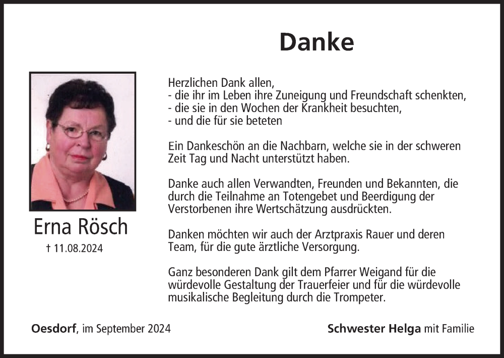 Hier finden Sie alle Traueranzeigen aus der Zeitung, die bisher für Erna Rösch erschienen sind. Weitere Traueranzeigen, die in der Zeitung erscheinen, werden hier ebenfalls aufgelistet