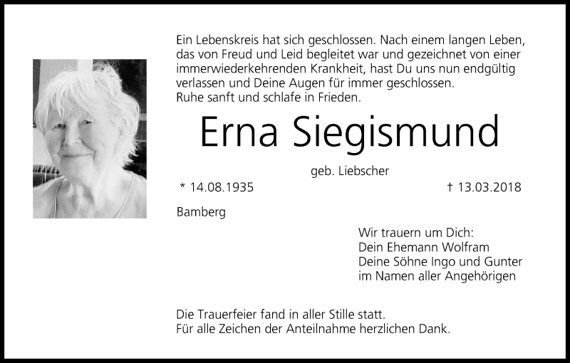 Hier finden Sie alle Traueranzeigen aus der Zeitung, die bisher für Erna Siegismund erschienen sind. Weitere Traueranzeigen, die in der Zeitung erscheinen, werden hier ebenfalls aufgelistet
