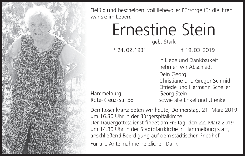 Hier finden Sie alle Traueranzeigen aus der Zeitung, die bisher für Ernestine Stein erschienen sind. Weitere Traueranzeigen, die in der Zeitung erscheinen, werden hier ebenfalls aufgelistet