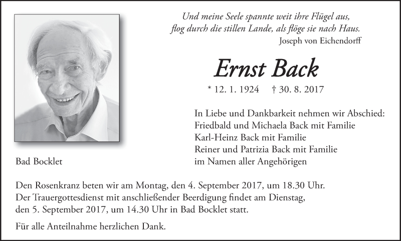 Hier finden Sie alle Traueranzeigen aus der Zeitung, die bisher für Ernst Back erschienen sind. Weitere Traueranzeigen, die in der Zeitung erscheinen, werden hier ebenfalls aufgelistet