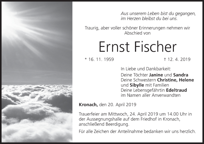 Hier finden Sie alle Traueranzeigen aus der Zeitung, die bisher für Ernst Fischer erschienen sind. Weitere Traueranzeigen, die in der Zeitung erscheinen, werden hier ebenfalls aufgelistet