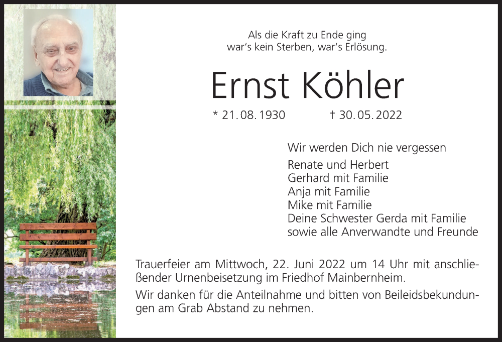 Hier finden Sie alle Traueranzeigen aus der Zeitung, die bisher für Ernst Köhler erschienen sind. Weitere Traueranzeigen, die in der Zeitung erscheinen, werden hier ebenfalls aufgelistet