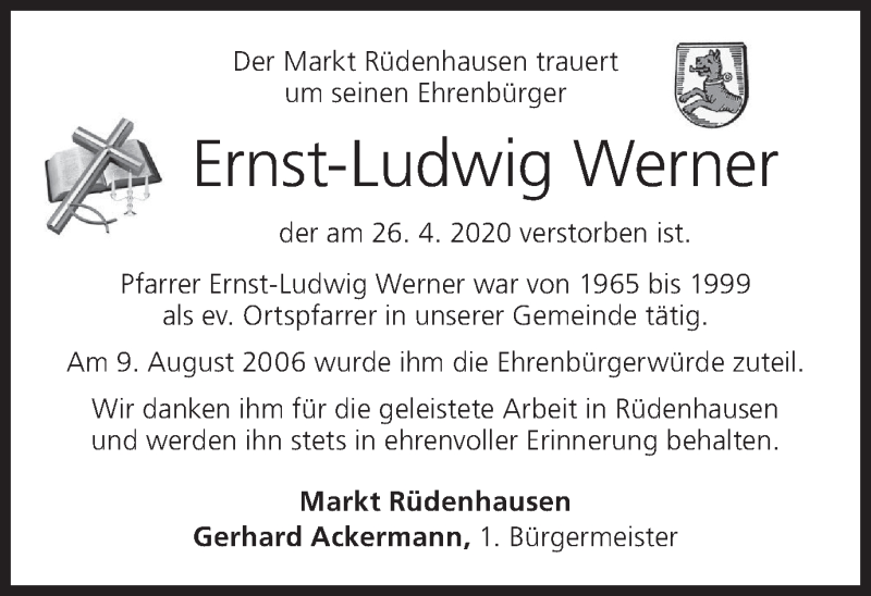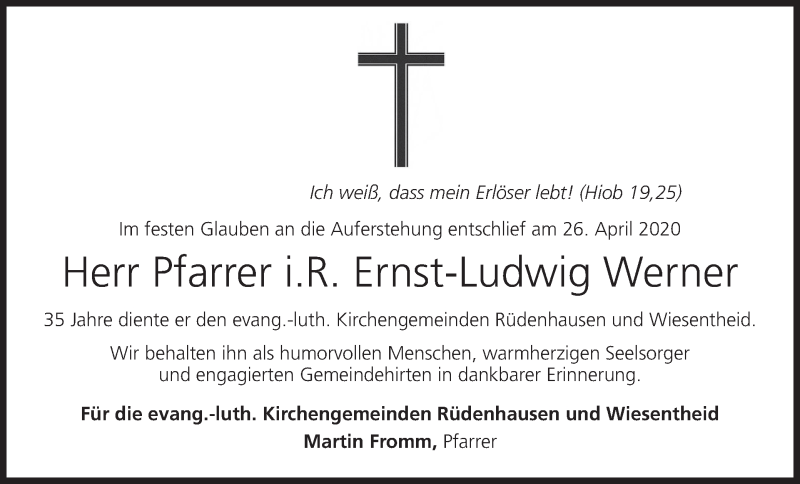 Hier finden Sie alle Traueranzeigen aus der Zeitung, die bisher für Ernst-Ludwig Werner erschienen sind. Weitere Traueranzeigen, die in der Zeitung erscheinen, werden hier ebenfalls aufgelistet