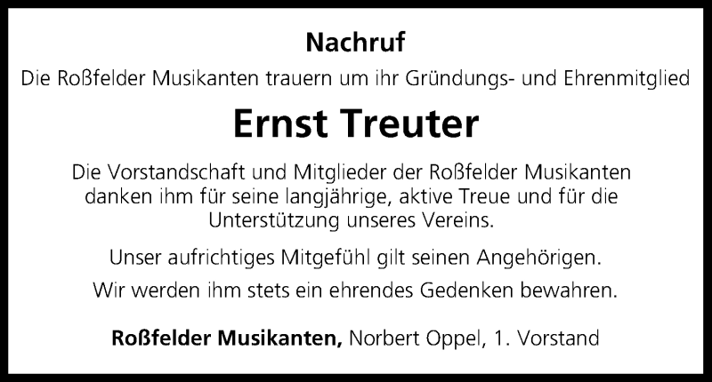 Hier finden Sie alle Traueranzeigen aus der Zeitung, die bisher für Ernst Treuter erschienen sind. Weitere Traueranzeigen, die in der Zeitung erscheinen, werden hier ebenfalls aufgelistet
