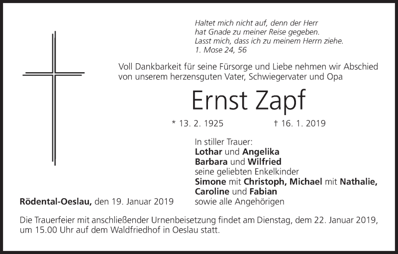 Hier finden Sie alle Traueranzeigen aus der Zeitung, die bisher für Ernst Zapf erschienen sind. Weitere Traueranzeigen, die in der Zeitung erscheinen, werden hier ebenfalls aufgelistet