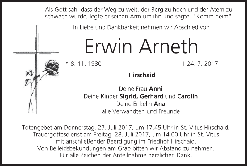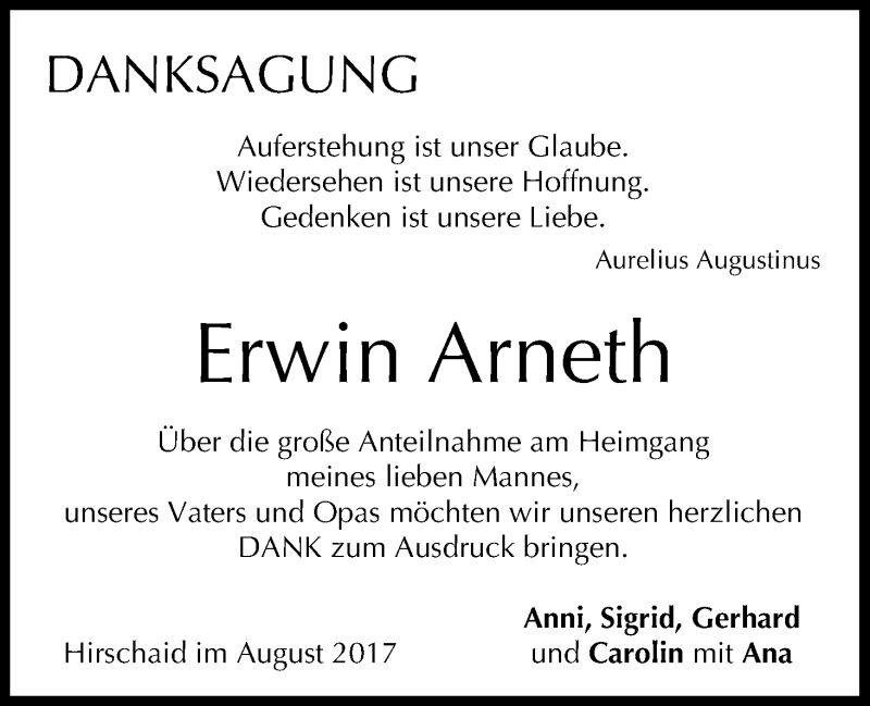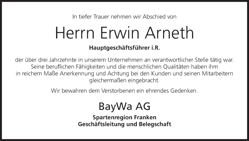 Hier finden Sie alle Traueranzeigen aus der Zeitung, die bisher für Erwin Arneth erschienen sind. Weitere Traueranzeigen, die in der Zeitung erscheinen, werden hier ebenfalls aufgelistet