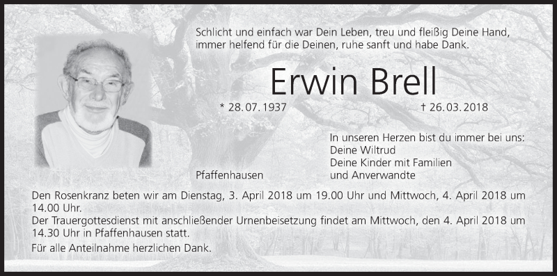 Hier finden Sie alle Traueranzeigen aus der Zeitung, die bisher für Erwin Brell erschienen sind. Weitere Traueranzeigen, die in der Zeitung erscheinen, werden hier ebenfalls aufgelistet