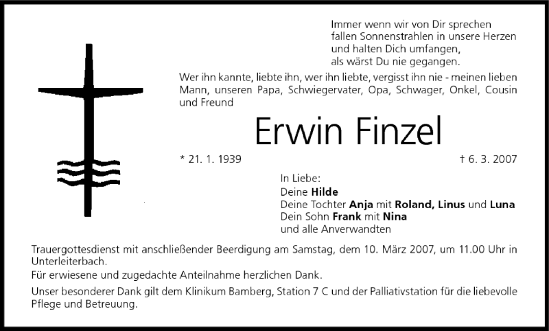 Hier finden Sie alle Traueranzeigen aus der Zeitung, die bisher für Erwin Finzel erschienen sind. Weitere Traueranzeigen, die in der Zeitung erscheinen, werden hier ebenfalls aufgelistet