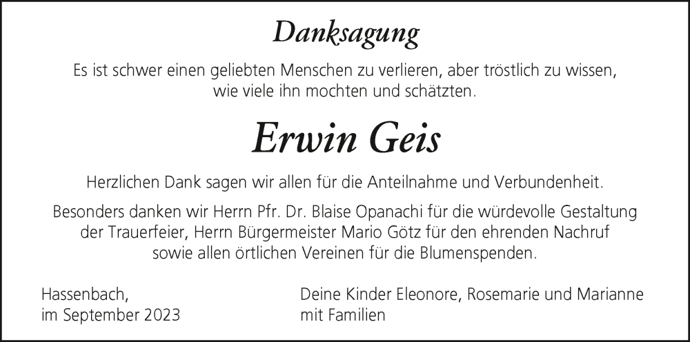 Hier finden Sie alle Traueranzeigen aus der Zeitung, die bisher für Erwin Geis erschienen sind. Weitere Traueranzeigen, die in der Zeitung erscheinen, werden hier ebenfalls aufgelistet