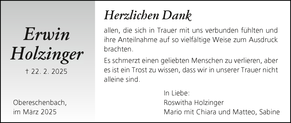 Hier finden Sie alle Traueranzeigen aus der Zeitung, die bisher für Erwin Holzinger erschienen sind. Weitere Traueranzeigen, die in der Zeitung erscheinen, werden hier ebenfalls aufgelistet