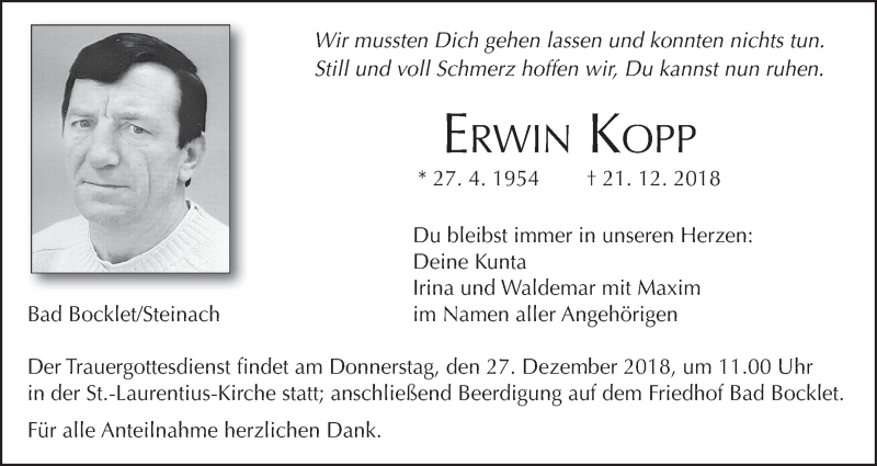 Hier finden Sie alle Traueranzeigen aus der Zeitung, die bisher für Erwin Kopp erschienen sind. Weitere Traueranzeigen, die in der Zeitung erscheinen, werden hier ebenfalls aufgelistet