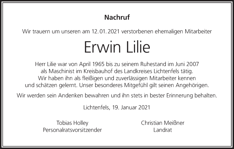 Hier finden Sie alle Traueranzeigen aus der Zeitung, die bisher für Erwin Lilie erschienen sind. Weitere Traueranzeigen, die in der Zeitung erscheinen, werden hier ebenfalls aufgelistet