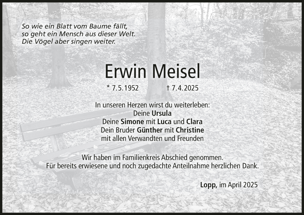 Hier finden Sie alle Traueranzeigen aus der Zeitung, die bisher für Erwin Meisel erschienen sind. Weitere Traueranzeigen, die in der Zeitung erscheinen, werden hier ebenfalls aufgelistet