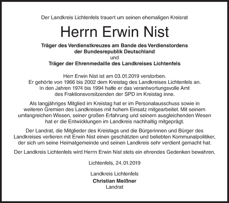 Hier finden Sie alle Traueranzeigen aus der Zeitung, die bisher für Erwin Nist erschienen sind. Weitere Traueranzeigen, die in der Zeitung erscheinen, werden hier ebenfalls aufgelistet
