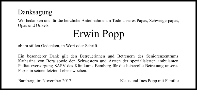 Hier finden Sie alle Traueranzeigen aus der Zeitung, die bisher für Erwin Popp erschienen sind. Weitere Traueranzeigen, die in der Zeitung erscheinen, werden hier ebenfalls aufgelistet