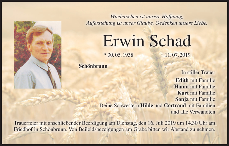 Hier finden Sie alle Traueranzeigen aus der Zeitung, die bisher für Erwin Schad erschienen sind. Weitere Traueranzeigen, die in der Zeitung erscheinen, werden hier ebenfalls aufgelistet