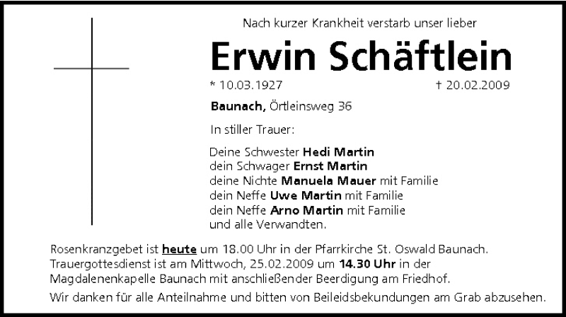 Hier finden Sie alle Traueranzeigen aus der Zeitung, die bisher für Erwin Schäftlein erschienen sind. Weitere Traueranzeigen, die in der Zeitung erscheinen, werden hier ebenfalls aufgelistet