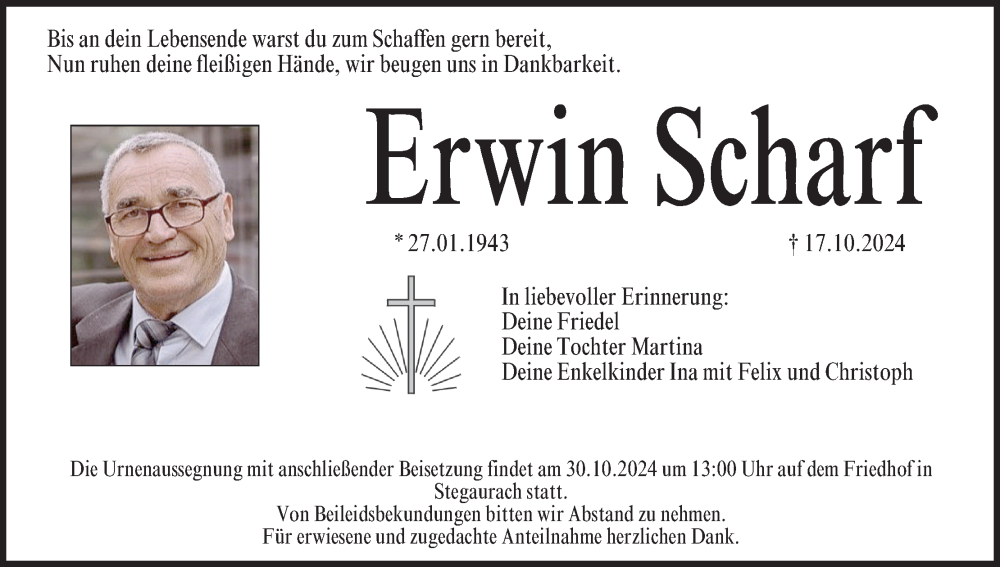 Hier finden Sie alle Traueranzeigen aus der Zeitung, die bisher für Erwin Scharf erschienen sind. Weitere Traueranzeigen, die in der Zeitung erscheinen, werden hier ebenfalls aufgelistet