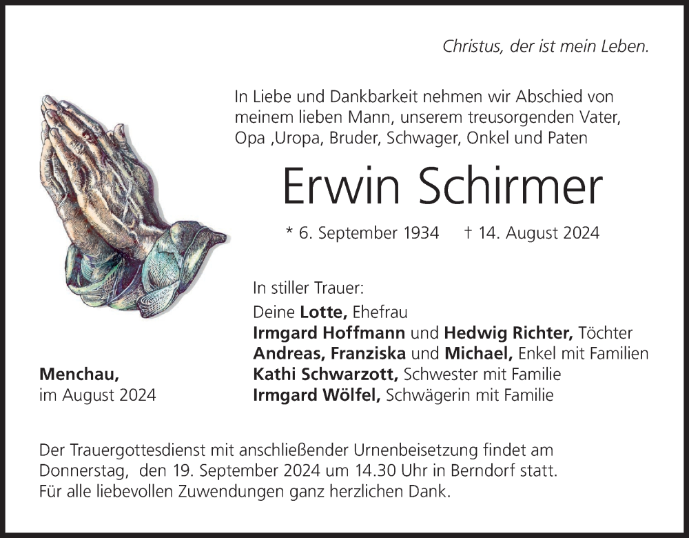 Hier finden Sie alle Traueranzeigen aus der Zeitung, die bisher für Erwin Schirmer erschienen sind. Weitere Traueranzeigen, die in der Zeitung erscheinen, werden hier ebenfalls aufgelistet