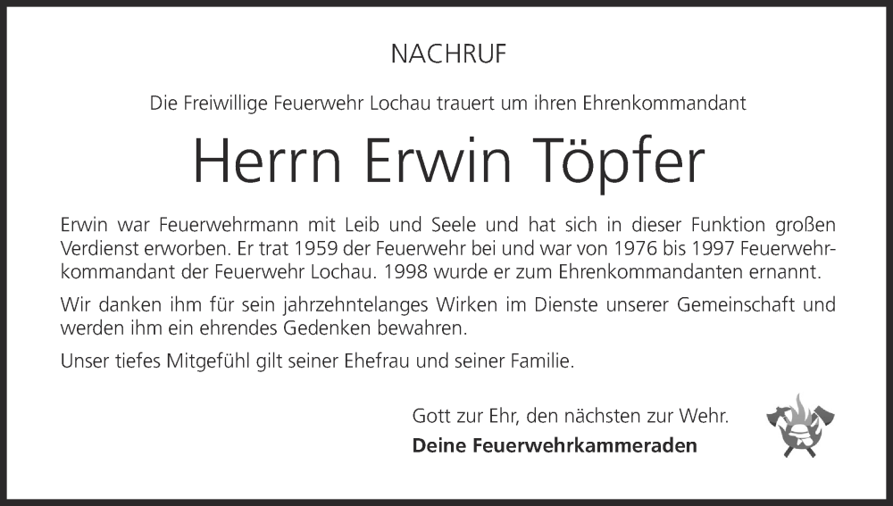 Hier finden Sie alle Traueranzeigen aus der Zeitung, die bisher für Erwin Töpfer erschienen sind. Weitere Traueranzeigen, die in der Zeitung erscheinen, werden hier ebenfalls aufgelistet