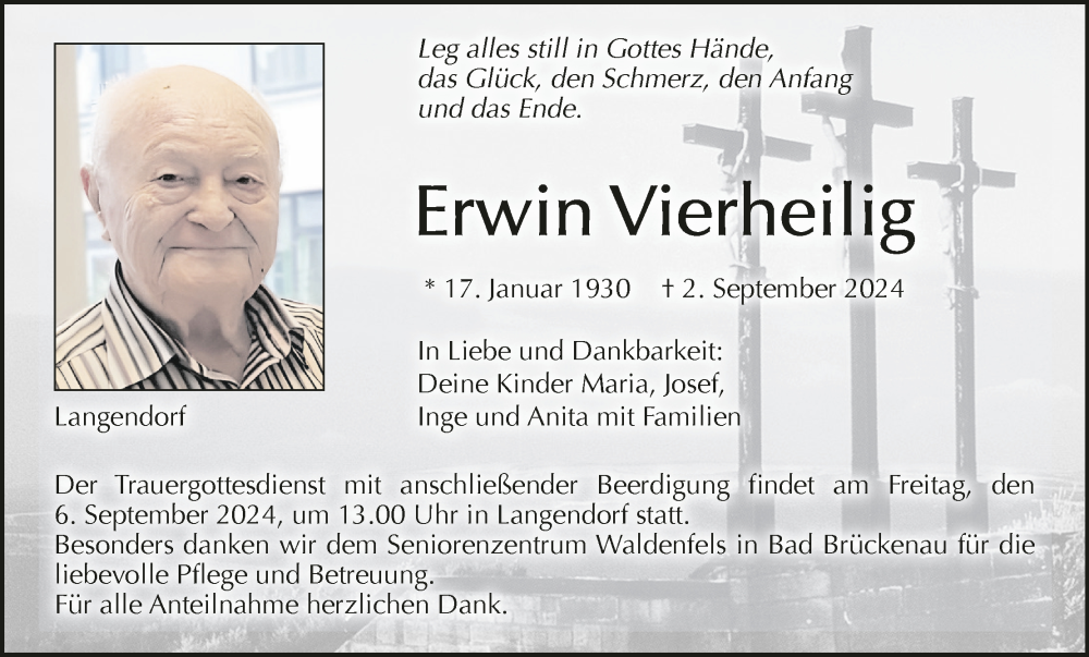 Hier finden Sie alle Traueranzeigen aus der Zeitung, die bisher für Erwin Vierheilig erschienen sind. Weitere Traueranzeigen, die in der Zeitung erscheinen, werden hier ebenfalls aufgelistet