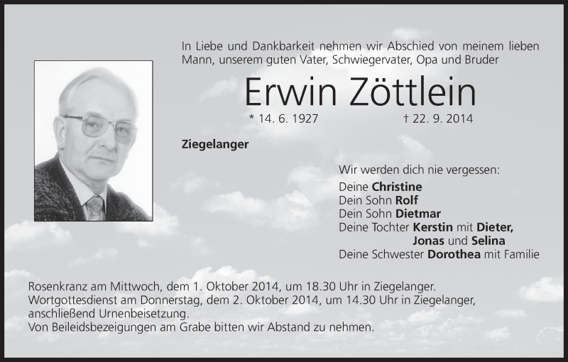 Hier finden Sie alle Traueranzeigen aus der Zeitung, die bisher für Erwin Zöttlein erschienen sind. Weitere Traueranzeigen, die in der Zeitung erscheinen, werden hier ebenfalls aufgelistet