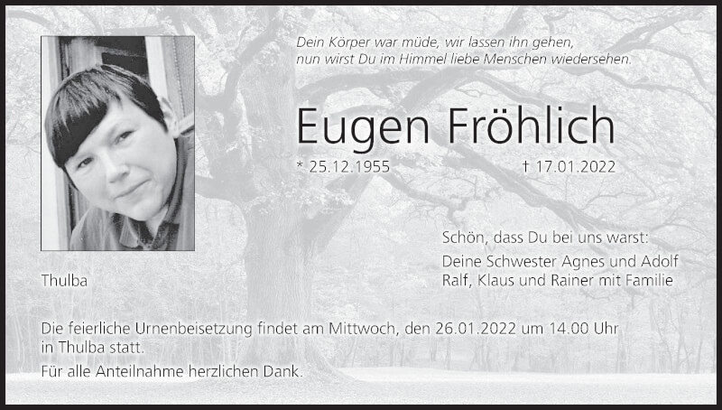 Hier finden Sie alle Traueranzeigen aus der Zeitung, die bisher für Eugen Fröhlich erschienen sind. Weitere Traueranzeigen, die in der Zeitung erscheinen, werden hier ebenfalls aufgelistet