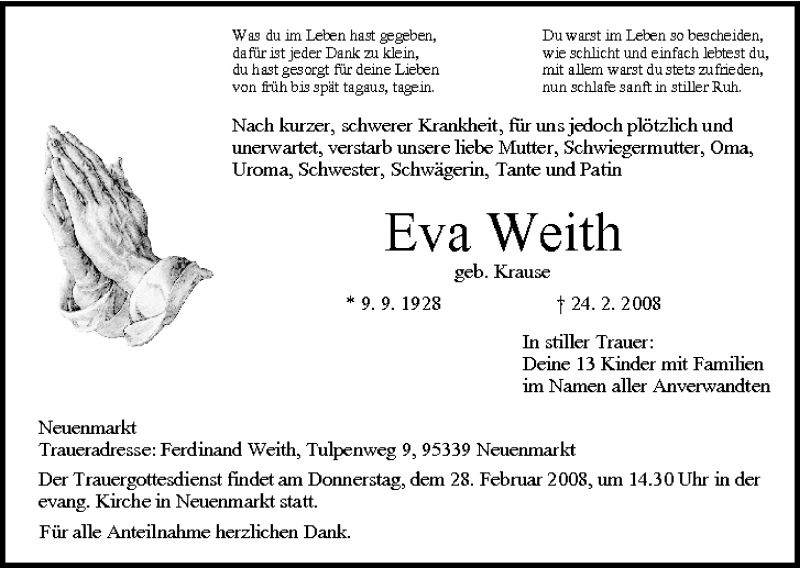 Hier finden Sie alle Traueranzeigen aus der Zeitung, die bisher für Eva Weith erschienen sind. Weitere Traueranzeigen, die in der Zeitung erscheinen, werden hier ebenfalls aufgelistet