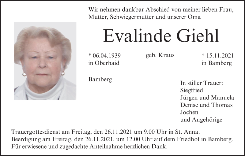 Hier finden Sie alle Traueranzeigen aus der Zeitung, die bisher für Evalinde Giehl erschienen sind. Weitere Traueranzeigen, die in der Zeitung erscheinen, werden hier ebenfalls aufgelistet