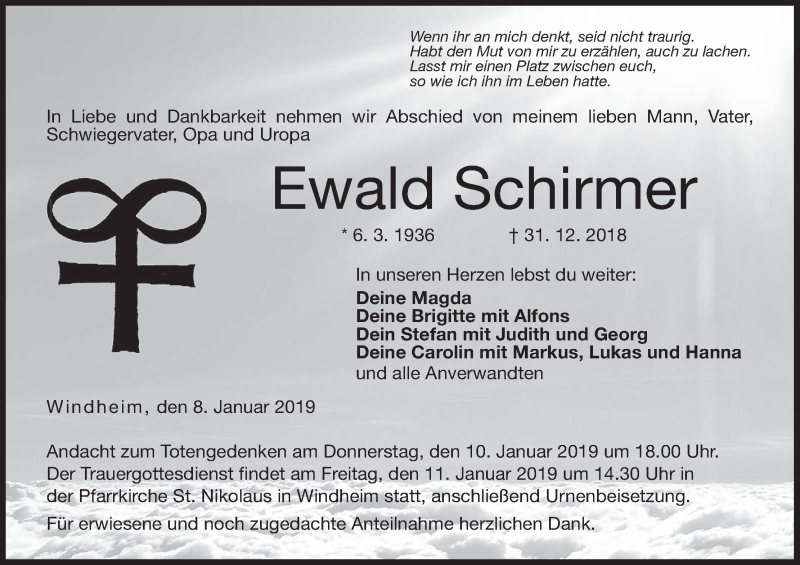 Hier finden Sie alle Traueranzeigen aus der Zeitung, die bisher für Ewald Schirmer erschienen sind. Weitere Traueranzeigen, die in der Zeitung erscheinen, werden hier ebenfalls aufgelistet