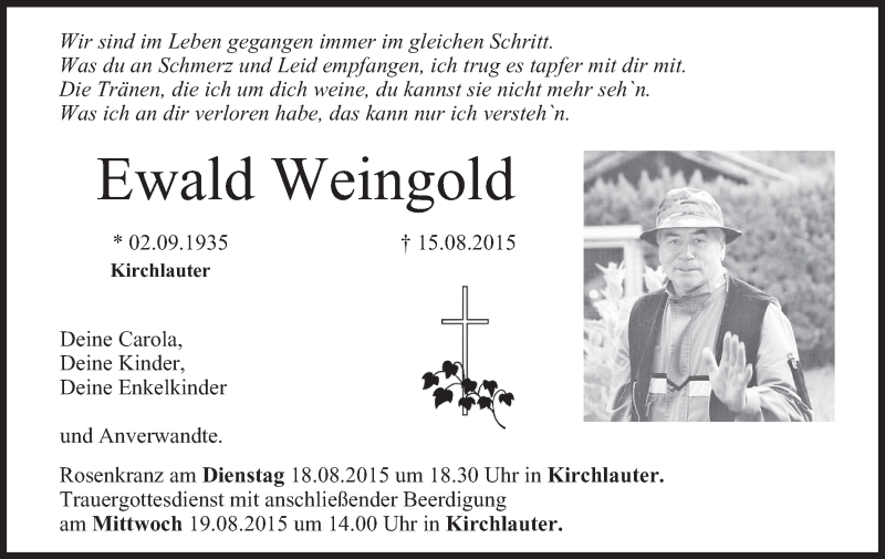 Hier finden Sie alle Traueranzeigen aus der Zeitung, die bisher für Ewald Weingold erschienen sind. Weitere Traueranzeigen, die in der Zeitung erscheinen, werden hier ebenfalls aufgelistet