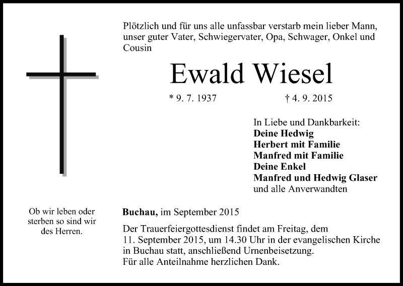 Hier finden Sie alle Traueranzeigen aus der Zeitung, die bisher für Ewald Wiesel erschienen sind. Weitere Traueranzeigen, die in der Zeitung erscheinen, werden hier ebenfalls aufgelistet