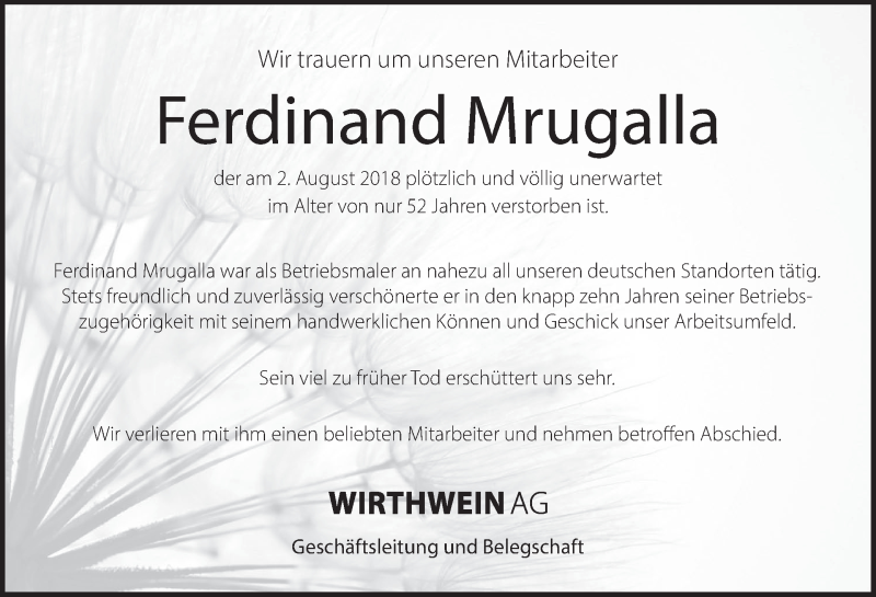 Hier finden Sie alle Traueranzeigen aus der Zeitung, die bisher für Ferdinand Mrugalla erschienen sind. Weitere Traueranzeigen, die in der Zeitung erscheinen, werden hier ebenfalls aufgelistet