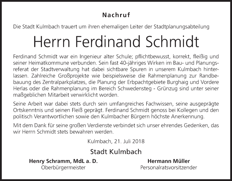 Hier finden Sie alle Traueranzeigen aus der Zeitung, die bisher für Ferdinand Schmidt erschienen sind. Weitere Traueranzeigen, die in der Zeitung erscheinen, werden hier ebenfalls aufgelistet