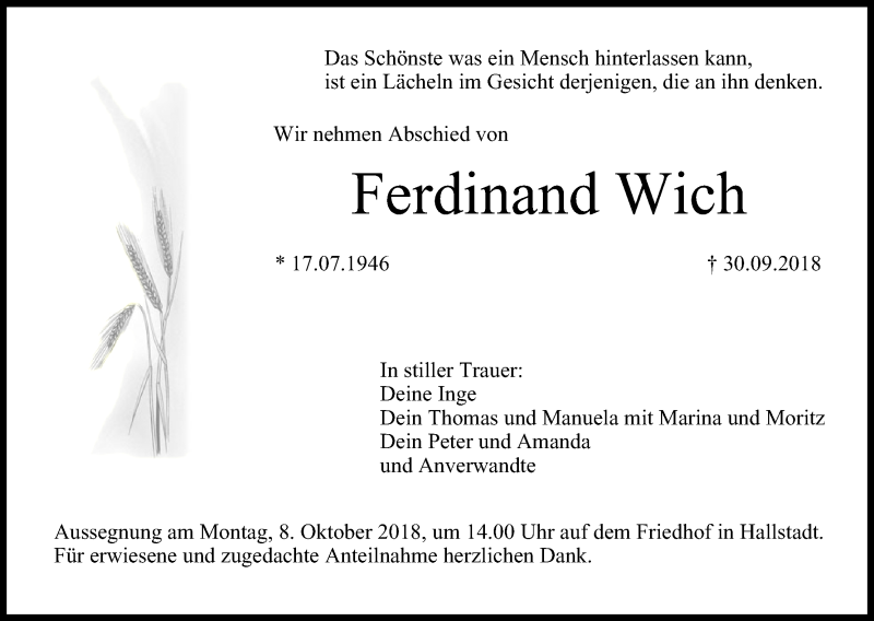 Hier finden Sie alle Traueranzeigen aus der Zeitung, die bisher für Ferdinand Wich erschienen sind. Weitere Traueranzeigen, die in der Zeitung erscheinen, werden hier ebenfalls aufgelistet