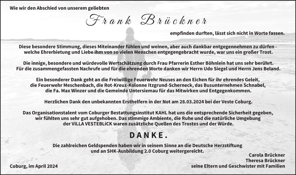 Hier finden Sie alle Traueranzeigen aus der Zeitung, die bisher für Frank Brückner erschienen sind. Weitere Traueranzeigen, die in der Zeitung erscheinen, werden hier ebenfalls aufgelistet