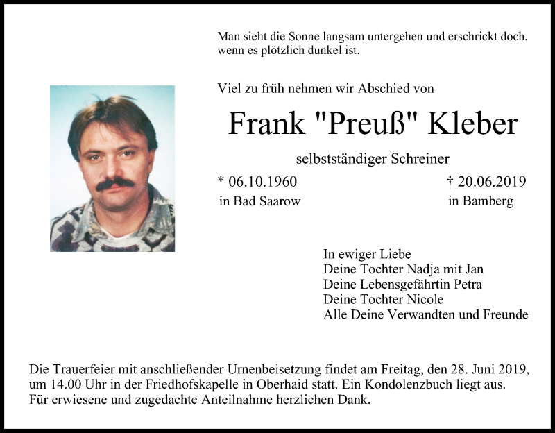 Hier finden Sie alle Traueranzeigen aus der Zeitung, die bisher für Frank Kleber erschienen sind. Weitere Traueranzeigen, die in der Zeitung erscheinen, werden hier ebenfalls aufgelistet