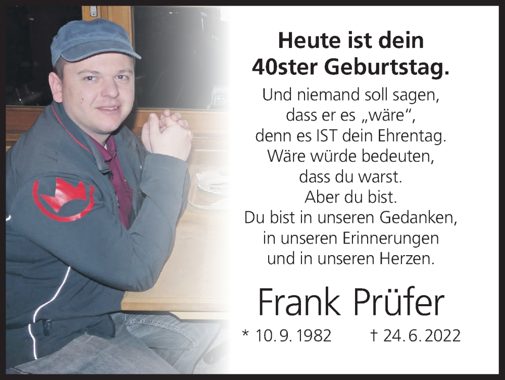 Hier finden Sie alle Traueranzeigen aus der Zeitung, die bisher für Frank Prüfer erschienen sind. Weitere Traueranzeigen, die in der Zeitung erscheinen, werden hier ebenfalls aufgelistet