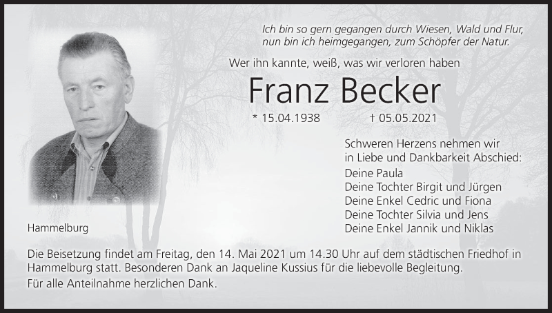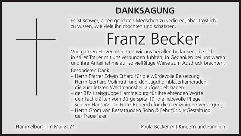 Hier finden Sie alle Traueranzeigen aus der Zeitung, die bisher für Franz Becker erschienen sind. Weitere Traueranzeigen, die in der Zeitung erscheinen, werden hier ebenfalls aufgelistet
