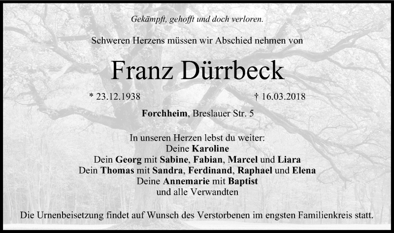 Hier finden Sie alle Traueranzeigen aus der Zeitung, die bisher für Franz Dürrbeck erschienen sind. Weitere Traueranzeigen, die in der Zeitung erscheinen, werden hier ebenfalls aufgelistet