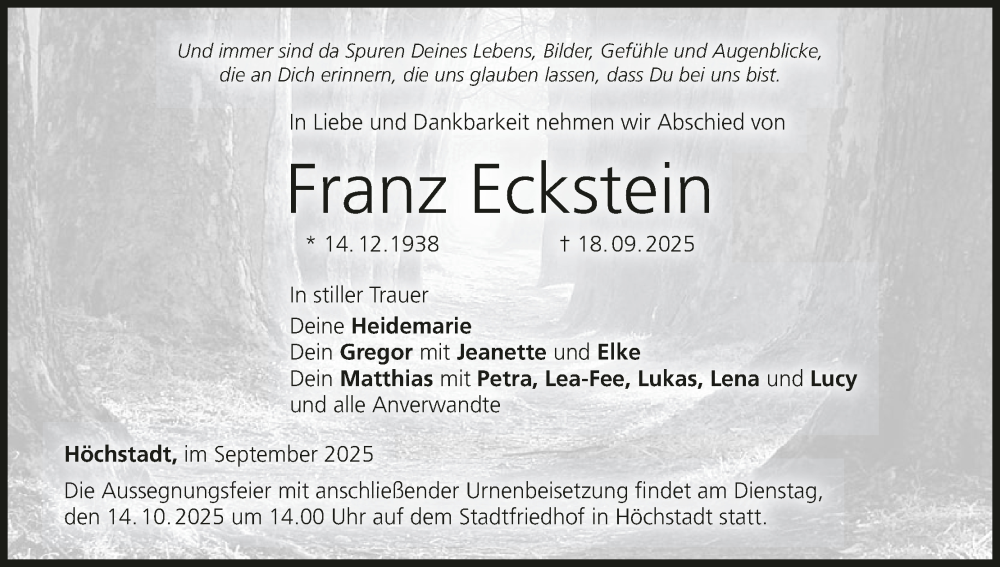 Hier finden Sie alle Traueranzeigen aus der Zeitung, die bisher für Franz Eckstein erschienen sind. Weitere Traueranzeigen, die in der Zeitung erscheinen, werden hier ebenfalls aufgelistet