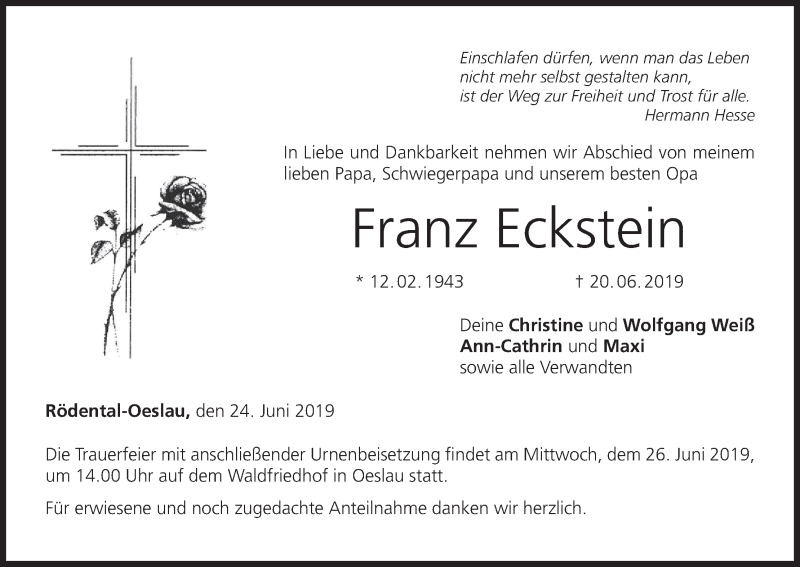 Hier finden Sie alle Traueranzeigen aus der Zeitung, die bisher für Franz Eckstein erschienen sind. Weitere Traueranzeigen, die in der Zeitung erscheinen, werden hier ebenfalls aufgelistet