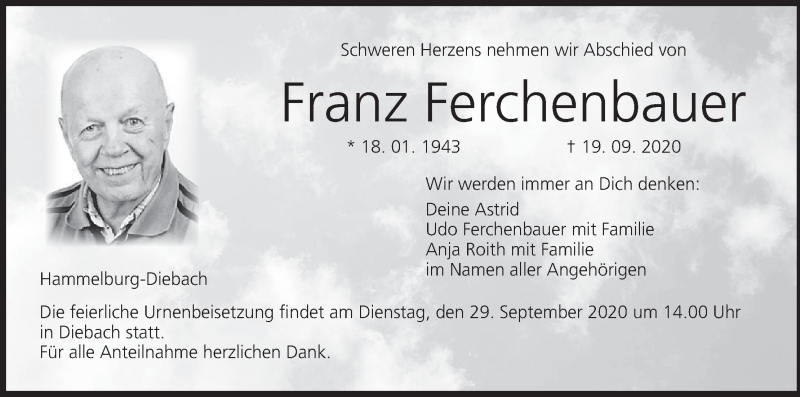 Hier finden Sie alle Traueranzeigen aus der Zeitung, die bisher für Franz Ferchenbauer erschienen sind. Weitere Traueranzeigen, die in der Zeitung erscheinen, werden hier ebenfalls aufgelistet