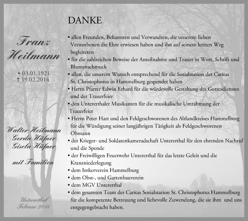 Hier finden Sie alle Traueranzeigen aus der Zeitung, die bisher für Franz Heilmann erschienen sind. Weitere Traueranzeigen, die in der Zeitung erscheinen, werden hier ebenfalls aufgelistet