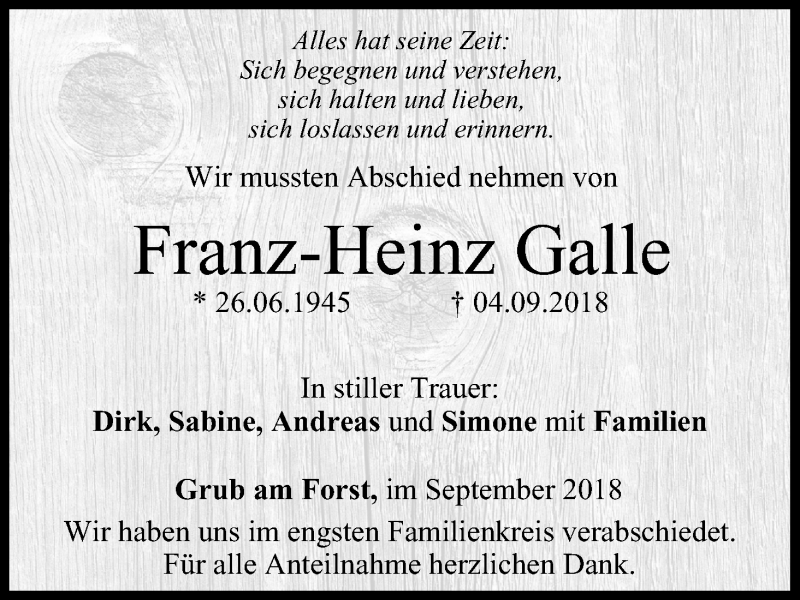 Hier finden Sie alle Traueranzeigen aus der Zeitung, die bisher für Franz-Heinz Galle erschienen sind. Weitere Traueranzeigen, die in der Zeitung erscheinen, werden hier ebenfalls aufgelistet